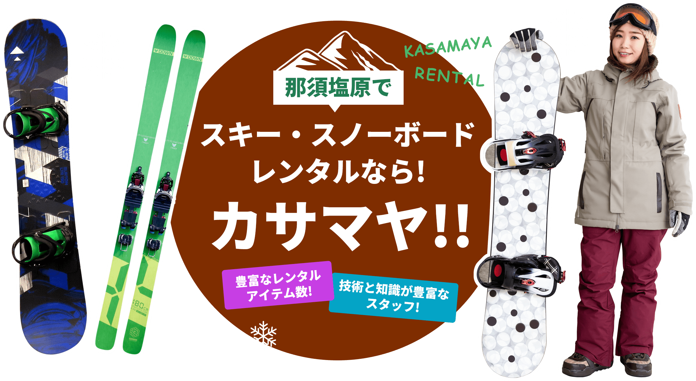 那須塩原市のスキー・スノーボードレンタルショップとして長年営業してきたカサマヤは、豊富なレンタル数とスタッフの知識力で、安心安全にスノースポーツを楽しんで頂くためのお手伝いを致します!